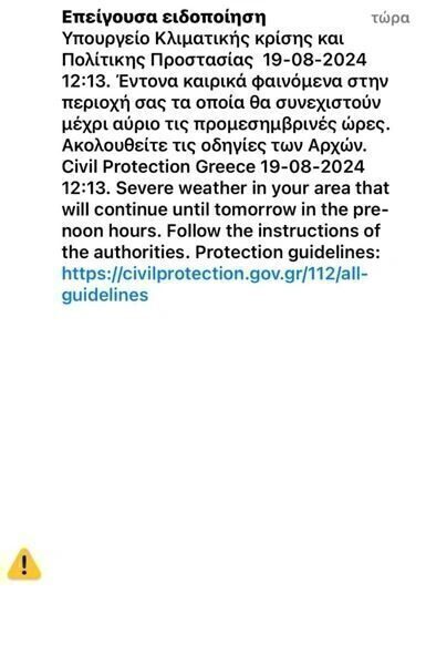 Σύμφωνα με το προειδοποιητικό μήνυμα, προβλέπονται έντονα καιρικά φαινόμενα, τα οποία θα συνεχιστούν μέχρι αύριο τις προμεσημβρινές ώρες, ενώ παράλληλα καλούνται οι πολίτες να ακολουθούν τις οδηγίες των αρχών. Το μήνυμα της Πολιτικής Προστασίας προειδοποιεί τους κατοίκους για έντονα καιρικά φαινόμενα στη περιοχή, τα οποία θα κρατήσουν ως αύριο Τρίτη (20/08) τις προμεσημβρινές ώρες.