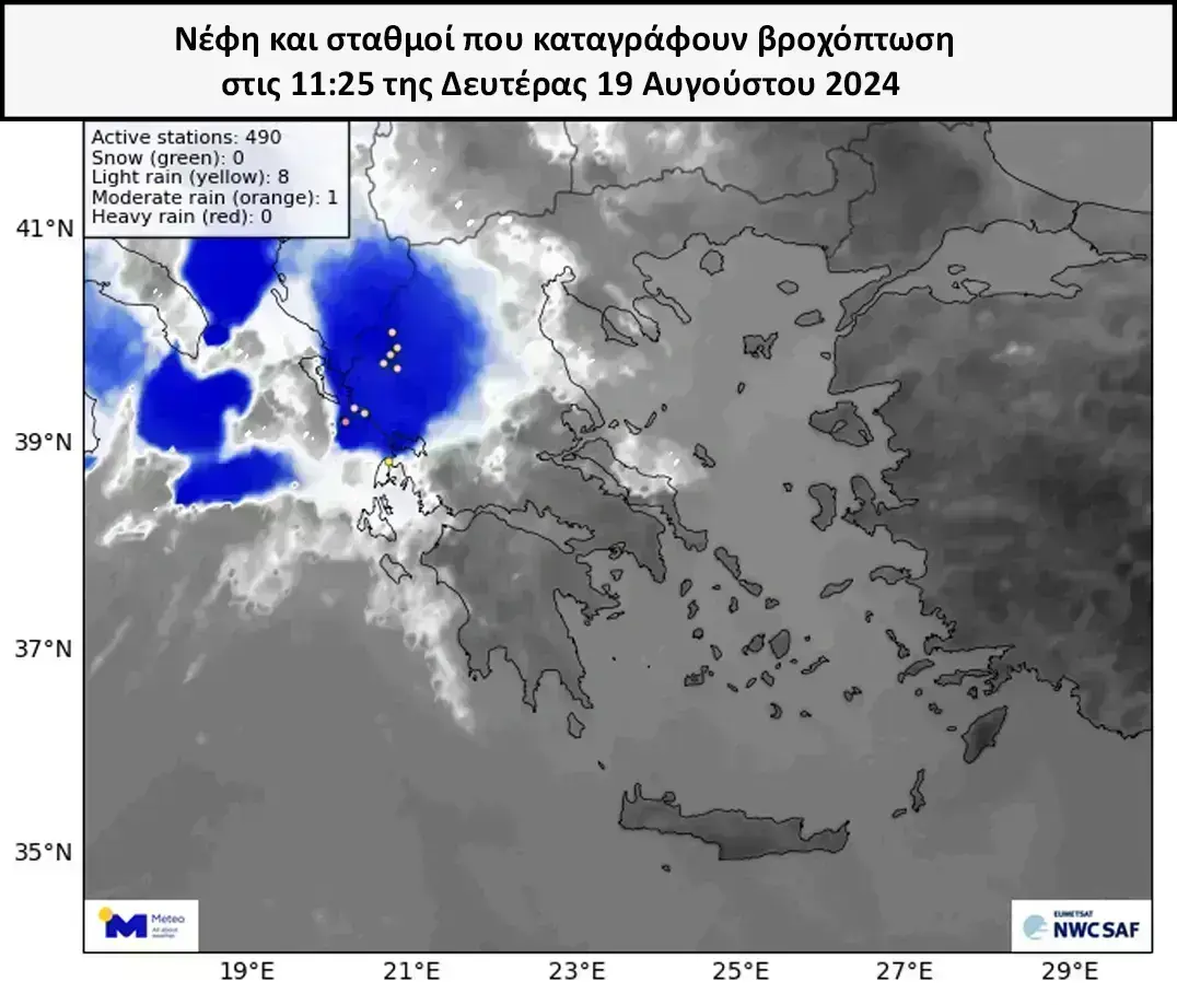 Στην εικόνα που ακολουθεί παρουσιάζονται τα νέφη όπως καταγράφηκαν από τον δορυφόρο Meteosat-10 (με μπλε αποχρώσεις οι υψηλότερες/ψυχρότερες κορυφές) καθώς και οι σταθμοί του δικτύου του meteo.gr/Εθνικού Αστεροσκοπείου Αθηνών που κατέγραφαν βροχή στις 11:25 ώρα Ελλάδος. Με κίτρινες κουκίδες σημειώνονται οι σταθμοί που καταγράφουν ασθενή βροχόπτωση, με πορτοκαλί αυτοί που καταγράφουν μέτρια βροχόπτωση και με κόκκινη αυτοί που καταγράφουν ισχυρή βροχόπτωση. Αξίζει να σημειωθεί ότι έως τις 11:40 ο σταθμός των Παξών έχει καταγράψει 45 χιλιοστά βροχής.