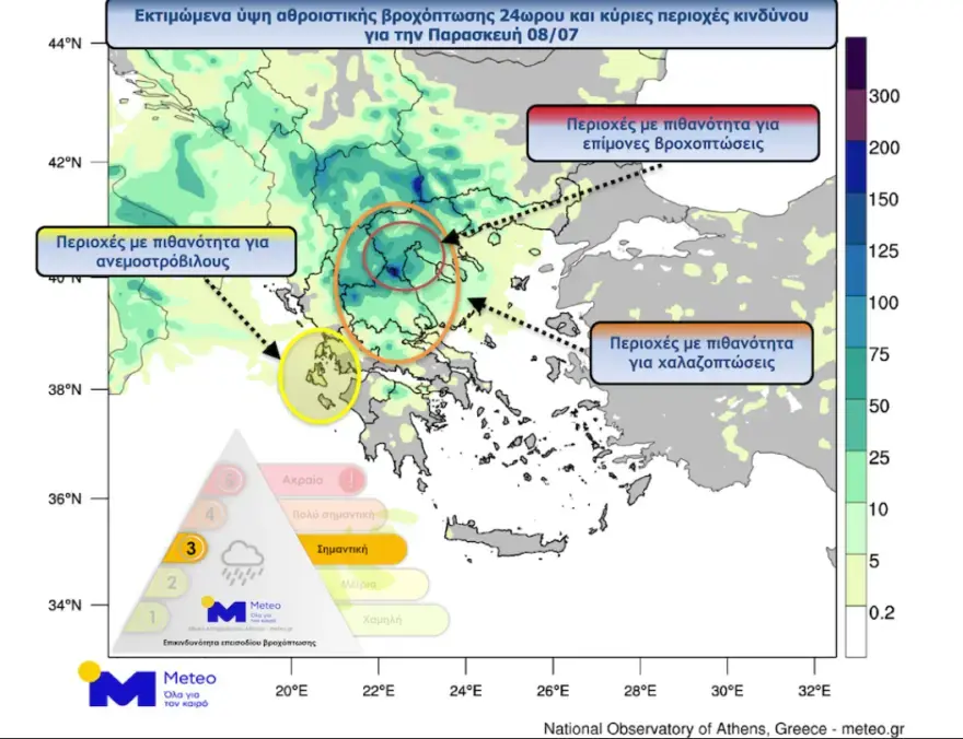 Η σημαντική επιδείνωση του καιρού αναμένεται σταδιακά από τα δυτικά και βόρεια της χώρας από σήμερα Παρασκευή 08/07 και η οποία αναμένεται να συνεχιστεί και κατα τη διάρκεια του Σαββάτου 09/07 με βροχές και τοπικά ισχυρές καταιγίδες. Το αναμενόμενο επεισόδιο βροχόπτωσης είναι Κατηγορίας 3 σύμφωνα με τον Δείκτη Επικινδυνότητας Επεισοδίου Βροχόπτωσης (Regional Precipitation Index – RPI) που έχει αναπτυχθεί και εφαρμόζεται επιχειρησιακά στο Εθνικό Αστεροσκοπείο Αθηνών / meteo.gr.