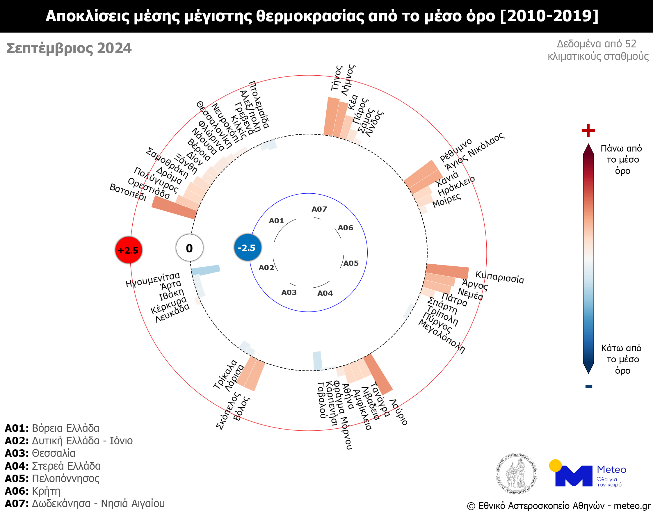 Ο παρακάτω χάρτης δείχνει τις αποκλίσεις της μέσης μέγιστης θερμοκρασίας τον Σεπτέμβριο 2024 ανά γεωγραφικό διαμέρισμα.