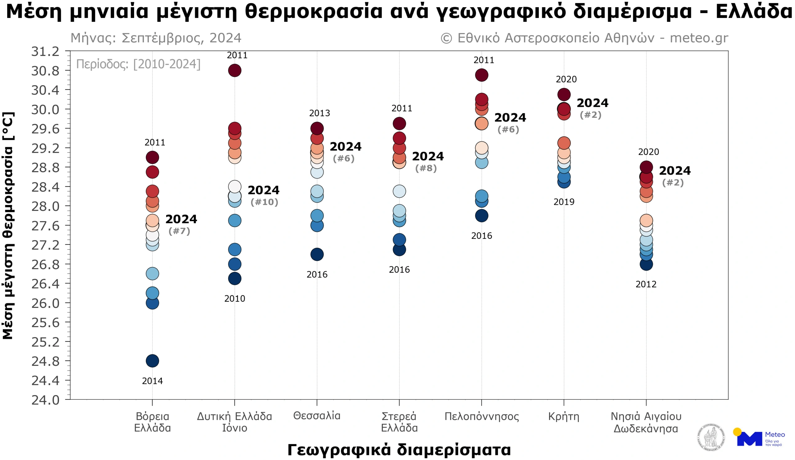 Το επόμενο γράφημα παρουσιάζει την κατάταξη του μήνα Σεπτεμβρίου ανά έτος, ανάλογα με τη μέση μηνιαία τιμή της μέγιστης θερμοκρασίας. Στα νησιά του Αιγαίου και στην Κρήτη ο φετινός Σεπτέμβριος καταγράφηκε ως ο 2ος θερμότερος από το 2010.