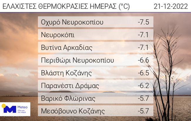 Η χαμηλότερη θερμοκρασία καταγράφηκε στον μετεωρολογικό σταθμό στο Οχυρό Νευροκοπίου και ήταν ίση με -7,5 βαθμούς Κελσίου. Οι επόμενες χαμηλότερες ελάχιστες θερμοκρασίες καταγράφηκαν σε Νευροκόπι (-7,1), Βυτίνα Αρκαδίας (-7,1), Περιθώρι Νευροκοπίου (-6,6), Βλάστη Κοζάνης (-6,5), Παρανέστι Δράμας (-6,2) και Βαρικό Φλώρινας (-5,7).