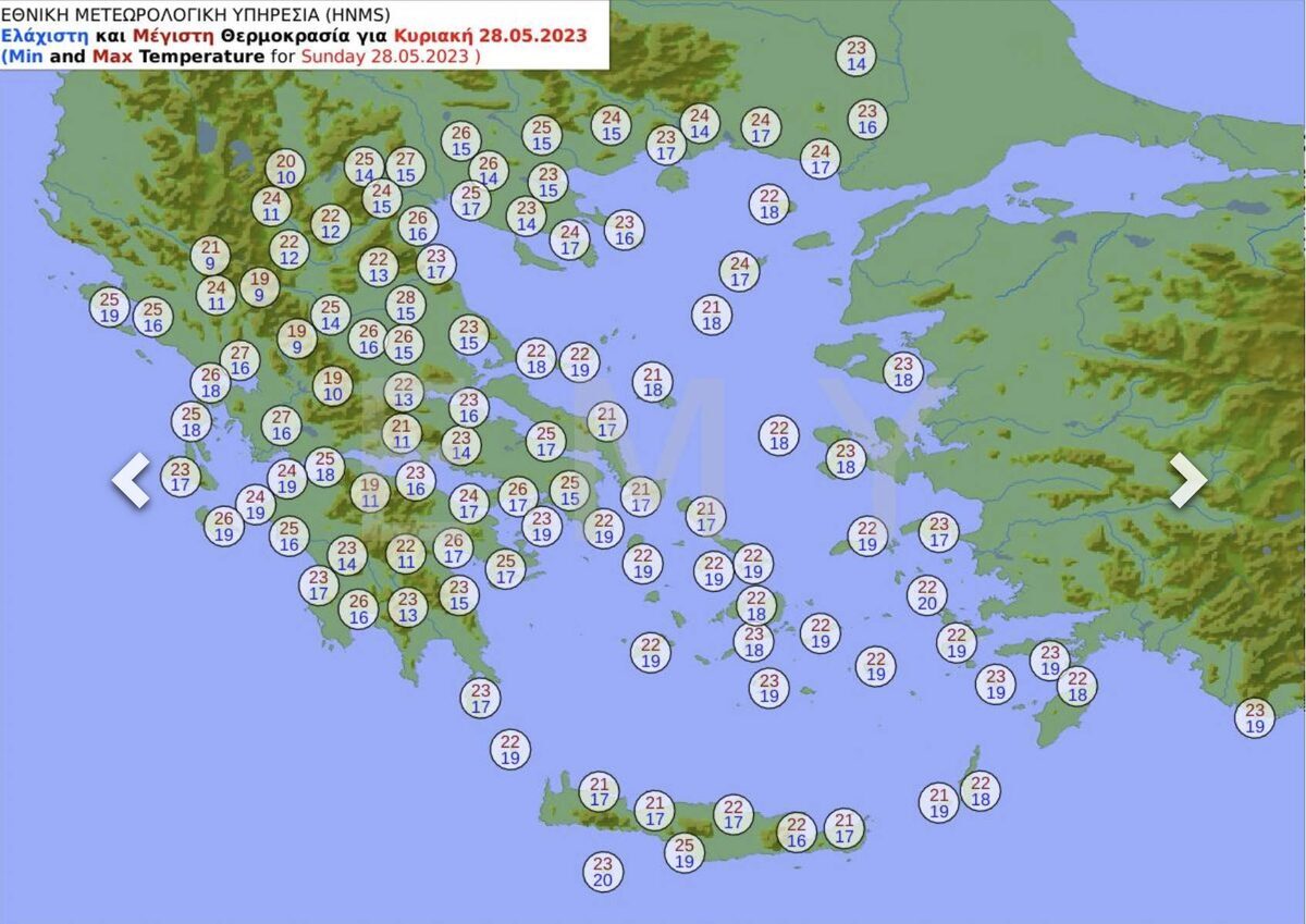 Η θερμοκρασία στη Δυτική Μακεδονία θα κυμανθεί από 12 έως 22 βαθμούς Κελσίου, στην υπόλοιπη Μακεδονία και στη Θράκη από 15 έως 27, στη Θεσσαλία από 16 έως 27, στην Ήπειρο από 13 έως 27, στη Στερεά και στην Πελοπόννησο από 14 έως 27, στα νησιά του Ιονίου από 16 έως 26, στα νησιά του Βορείου και Ανατολικού Αιγαίου από 17 έως 25, στις Κυκλάδες από 17 έως 24, στα Δωδεκάνησα από 19 έως 23 και στην Κρήτη από 17 έως 25 βαθμούς Κελσίου.