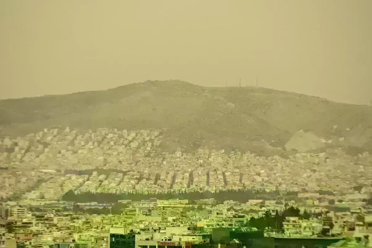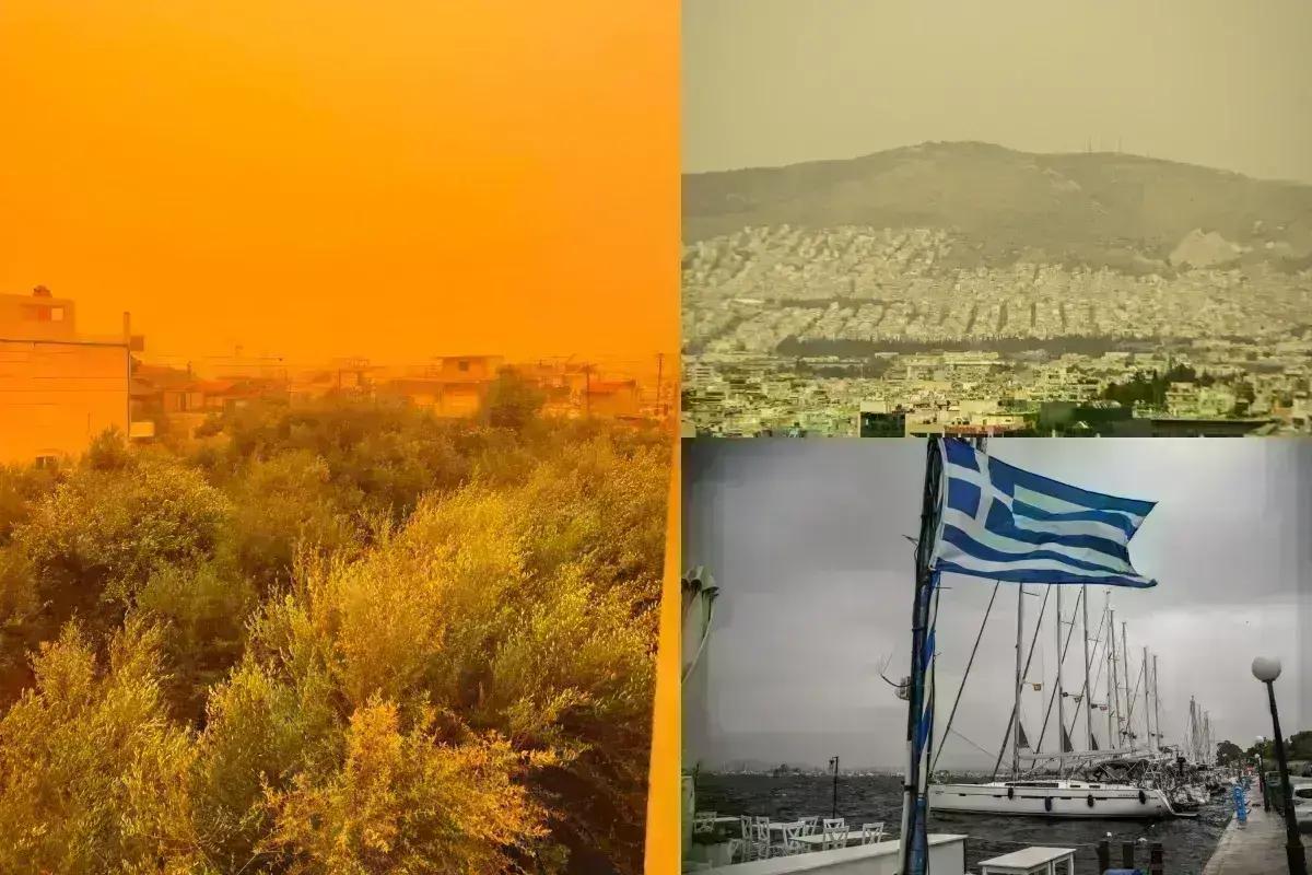 Ο ουρανός είναι κόκκινος, η ατμόσφαιρα αποπνικτική. Αυτοκίνητα έχουν καλυφθεί από τη σκόνη της Σαχάρας. Η ορατότητα στην Αττική είναι περιορισμένη.