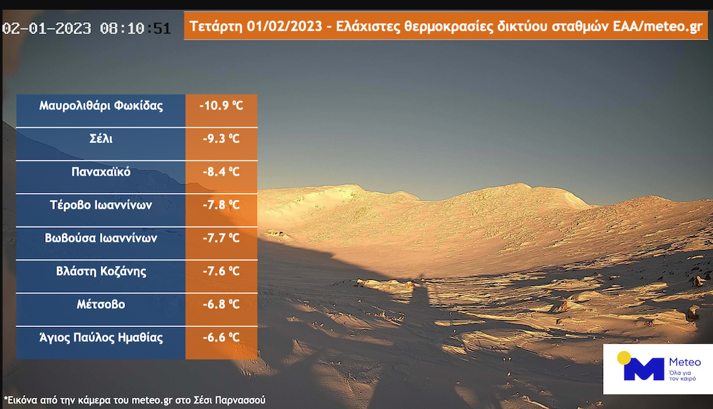 Στον παρακάτω πίνακα παρουσιάζονται οι οκτώ χαμηλότερες ελάχιστες θερμοκρασίες σύμφωνα με το δίκτυο αυτόματων μετεωρολογικών σταθμών του Εθνικού Αστεροσκοπείου Αθηνών / meteo.gr.