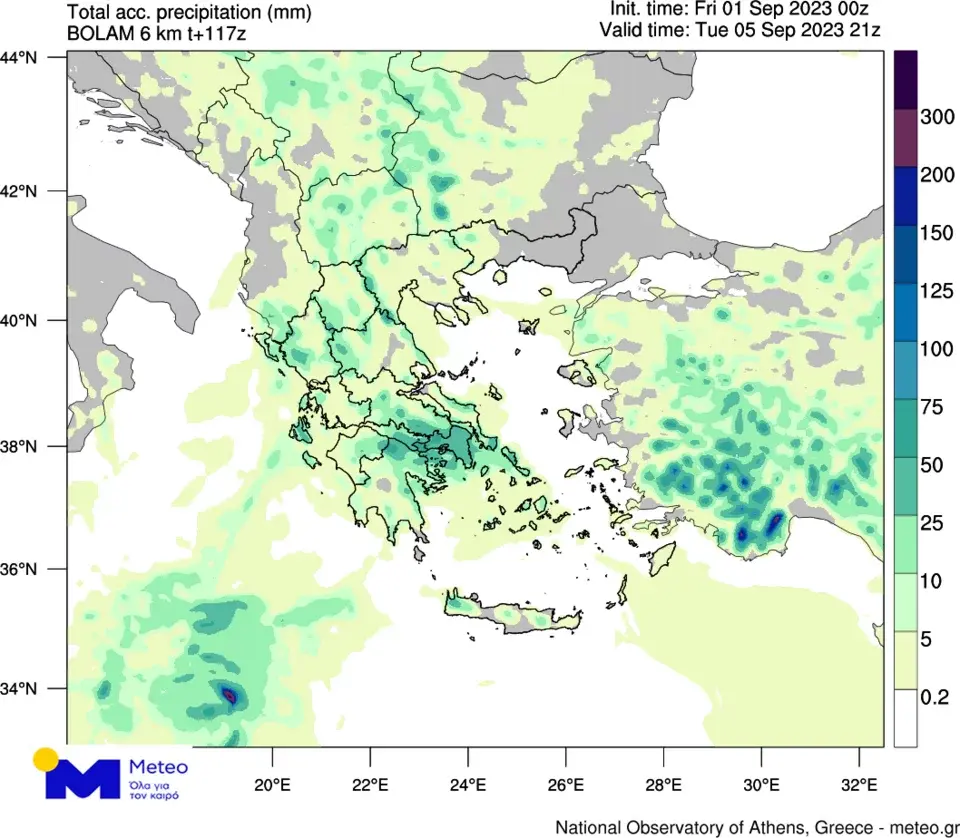 Από το συνολικό ύψος βροχής σε χιλιοστά που προβλέπει το αριθμητικό μοντέλο του Εθνικού Αστεροσκοπείου Αθηνών/meteo.gr μέχρι την Τρίτη 5/9, φαίνεται ότι η περιοχή του Έβρου θα είναι από τις ελάχιστες περιοχές της χώρας μας που δεν θα δεχθεί βροχοπτώσεις.