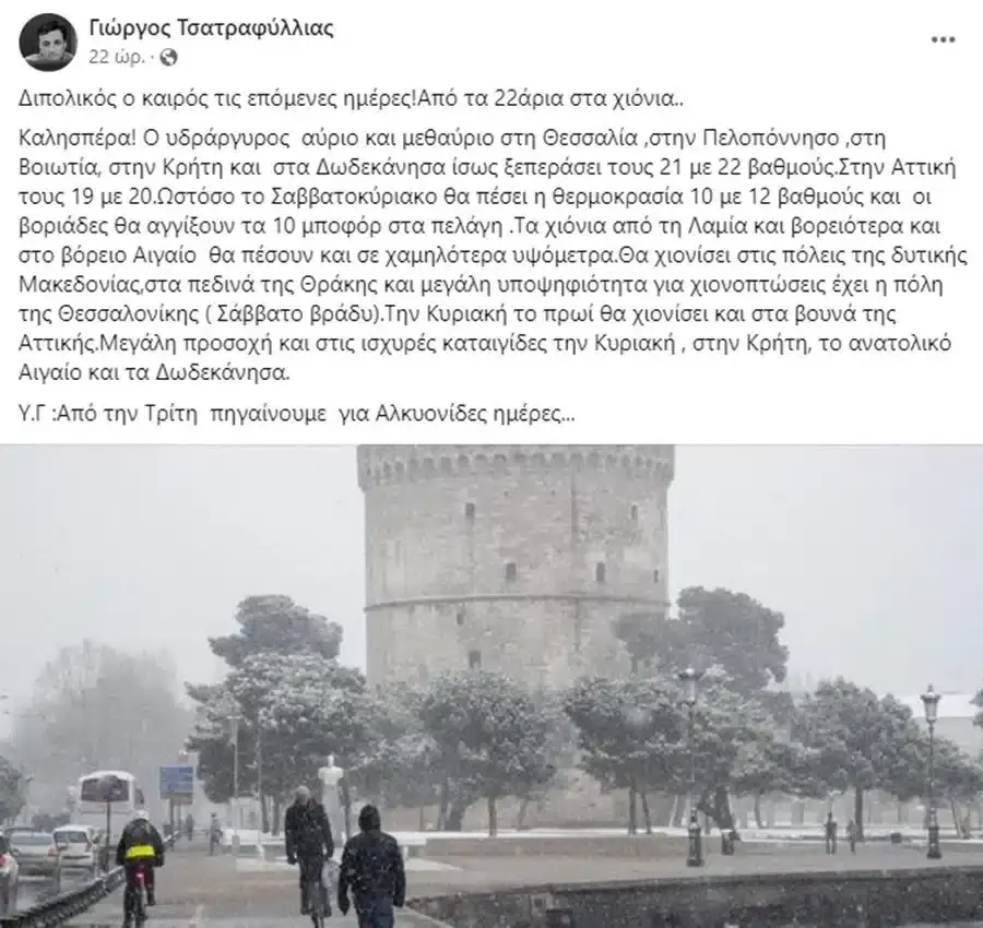 Ο Κλέαρχος Μαρουσάκης σε είπε ότι το Σάββατο σταδιακά τα χιόνια προς τη κεντρική και βόρεια χώρα θα κατεβαίνουν πολύ χαμηλά.