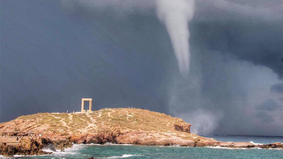 Με τις καιρικές συνθήκες να είναι έντονες στην ευρύτερη περιοχή, ο υδροστρόβιλος, που ξεκίνησε από την Τήνο και τη Μύκονο, έφτασε έως τη Νάξο και χάρισε ένα σπάνιο θέαμα σε όσους βρέθηκαν κοντά στο λιμάνι του νησιού.