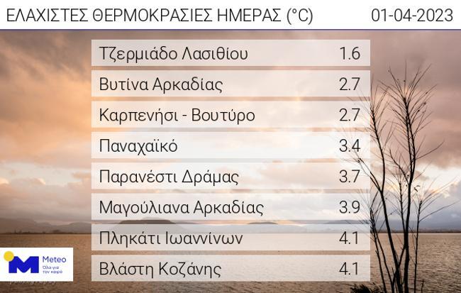 Σε θετικές τιμές παρέμεινε ο υδράργυρος το πρωί του Σαββάτου 01/04, με την ελάχιστη θερμοκρασία να σημειώνεται στο Τζερμιάδο Λασιθίου (1.6 βαθμούς Κελσίου). Στον πίνακα που ακολουθεί παρουσιάζονται οι 8 σταθμοί του δικτύου αυτόματων μετεωρολογικών σταθμών του Εθνικού Αστεροσκοπείου Αθηνών / meteo.gr που κατέγραψαν τις χαμηλότερες ελάχιστες θερμοκρασίες το πρωί του Σαββάτου 01/04.