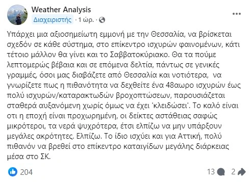 «Υπάρχει μια αξιοσημείωτη εμμονή με την Θεσσαλία, να βρίσκεται σχεδόν σε κάθε σύστημα, στο επίκεντρο ισχυρών φαινομένων, κάτι τέτοιο μάλλον θα γίνει και το Σαββατοκύριακο. Θα τα πούμε λεπτομερώς βέβαια και σε επόμενα δελτία, πάντως σε γενικές γραμμές, όσοι μας διαβάζετε από Θεσσαλία και νοτιότερα, να γνωρίζετε πως η πιθανότητα να δεχθείτε ένα 48αωρο ισχυρών έως πολύ ισχυρών/καταρακτωδών βροχοπτώσεων, παρουσιάζεται σταθερά αυξανόμενη χωρίς όμως να έχει ‘κλειδώσει’. Το καλό είναι οτι η εποχή είναι προχωρημένη, οι δείκτες αστάθειας σαφώς μικρότεροι, τα νερά ψυχρότερα, έτσι ελπίζω να μην υπάρξουν μεγάλες ακρότητες. Ελπίζω. Το ίδιο ισχύει και για Αττική, πολύ πιθανόν να βρεθεί στο επίκεντρο καταιγίδων μεγάλης διάρκειας μέσα στο ΣΚ.» αναφέρει η ανάρτηση της σελίδας Weather Analysis.