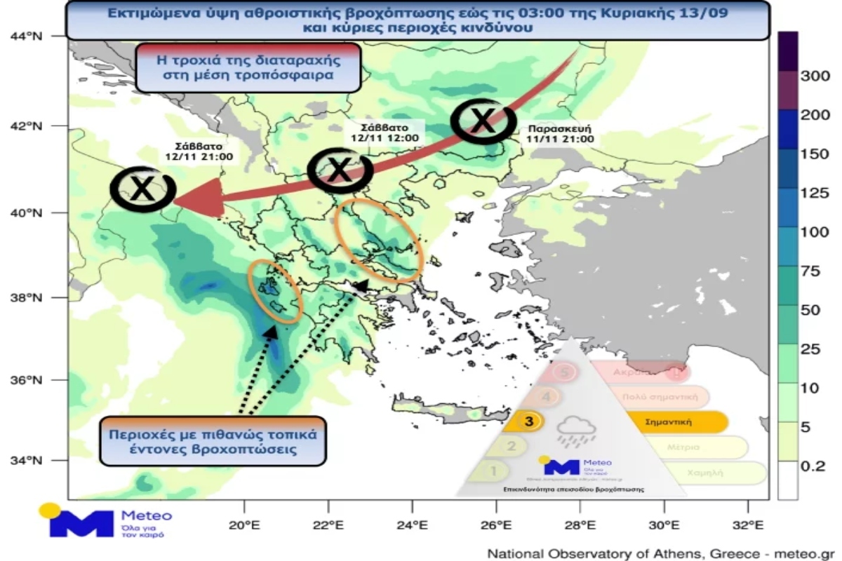Όσον αφορά τον Δείκτη Επικινδυνότητας Επεισοδίου Βροχόπτωσης (Regional Precipitation Index – RPI), το επεισόδιο βροχόπτωσης αναμένεται να είναι Κατηγορίας 3 το Σάββατο 12/11.