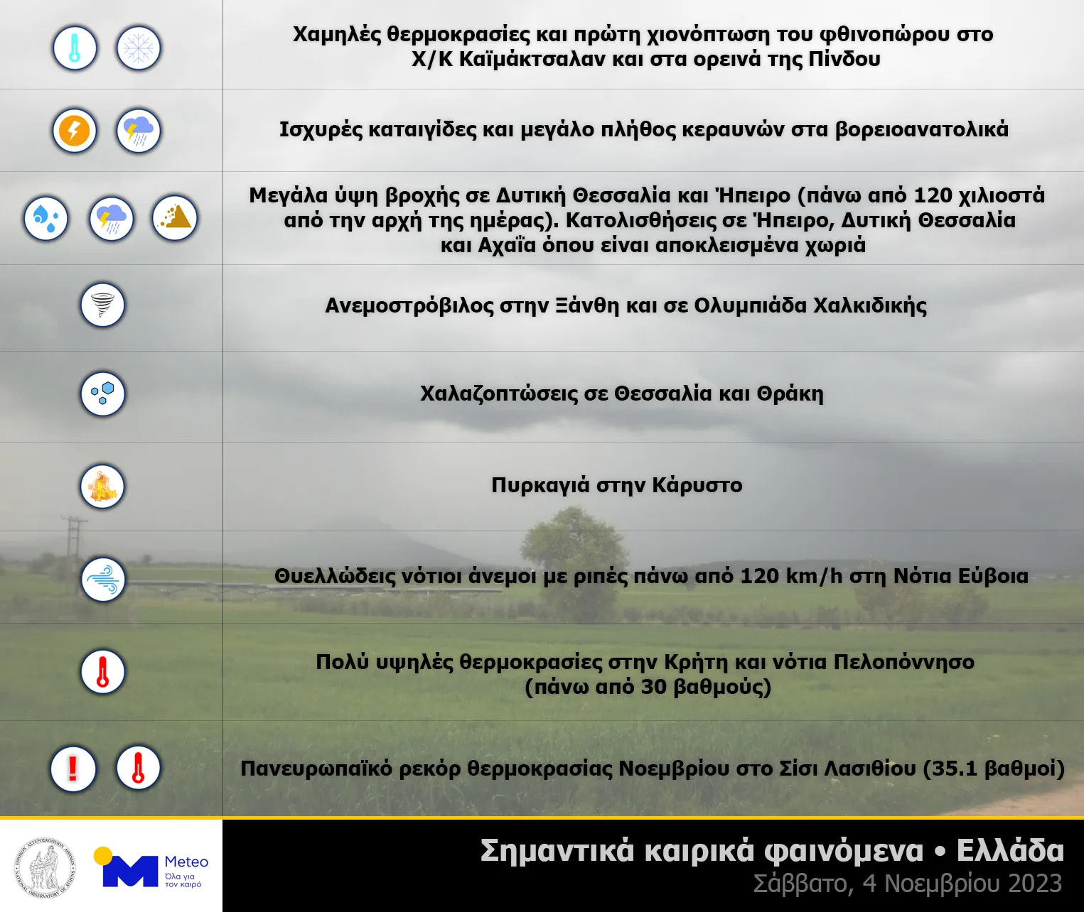 Λόγω της διέλευσης του ψυχρού μετώπου από τη χώρα μας, μέχρι και τις μεσημεριανές ώρες του Σαββάτου 04/11, εκδηλώθηκε μεγάλο πλήθος φαινομένων με σημαντική γεωγραφική διασπορά. Τα φαινόμενα συνοψίζονται στο γραφικό που ακολουθεί.