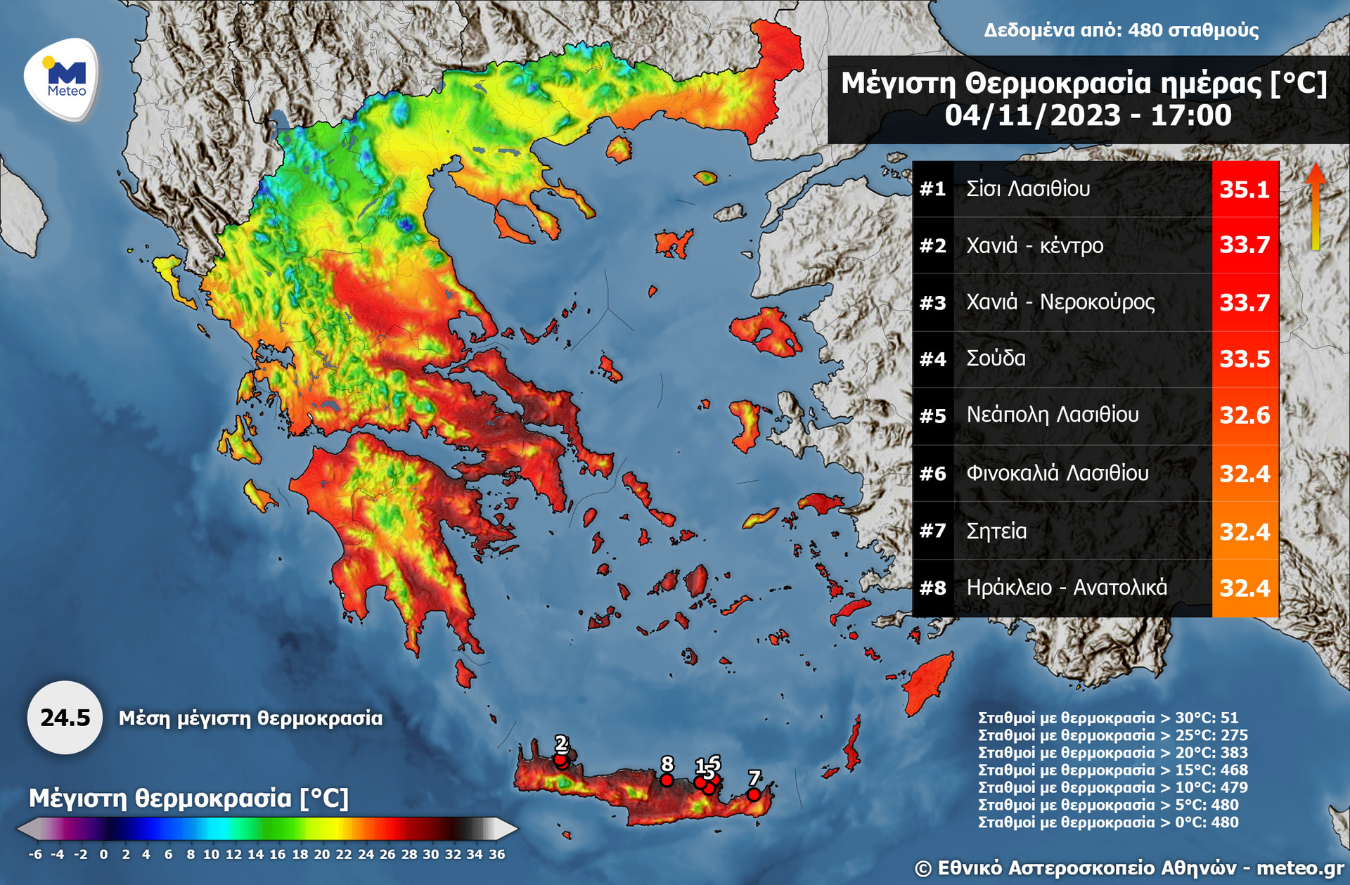 Όσων αφορά στις μέγιστες θερμοκρασίες, η γεωγραφική κατανομή των οποίων αποτυπώνεται στο χάρτη που ακολουθεί, 51 μετεωρολογικοί σταθμοί κατέγραψαν μέγιστες άνω των 30 βαθμών. Η μεγαλύτερη εξ αυτών σημειώθηκε στο Σίσι Λασιθίου, όπου οι 35,1 βαθμοί που καταγράφηκαν αποτελούν Πανευρωπαϊκό Ρεκόρ Νοεμβρίου.