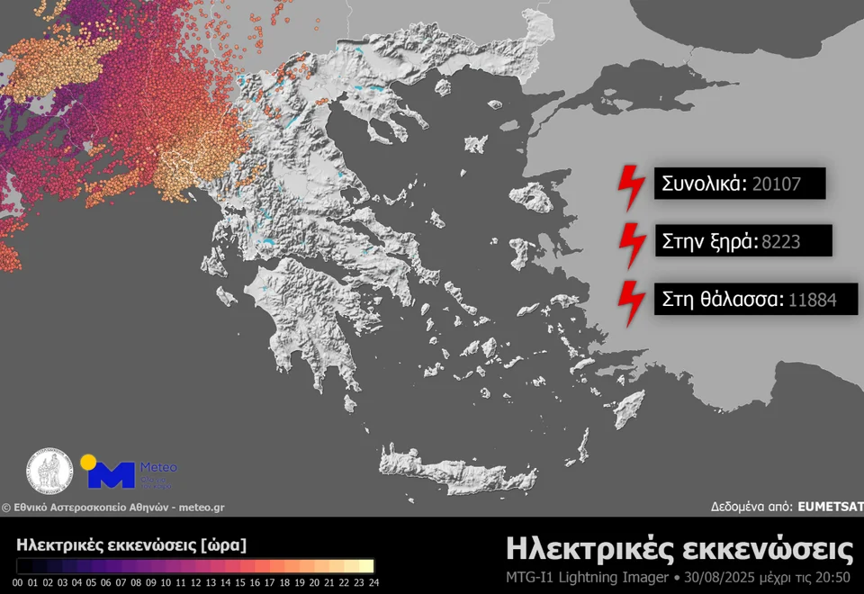 H ανάλυση δεδομένων από τον Ευρωπαϊκό μετεωρολογικό δορυφόρο τρίτης γενιάς Meteosat-12 και το Lightning Imager (LI) όργανο που φέρει, έδειξε ότι μέχρι τις 21:00 το βράδυ του Σαββάτου 30 Αυγούστου 2025 έχουν καταγραφεί στις προαναφερθείσες περιοχές περισσότερες από 20.000 ηλεκτρικές εκκενώσεις, εκ των οποίων σχεδόν 8.000 στην ξηρά και σχεδόν 12.000 στη θάλασσα, όπως φαίνεται στον παρακάτω χάρτη.