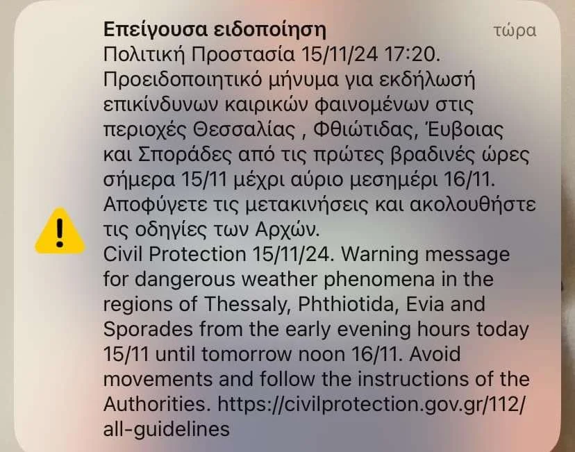 Λίγο πριν τις 17:30, ήχησε το 112 στη Θεσσαλία, την Εύβοια, τις Σποράδες και τη Φθιώτιδα.