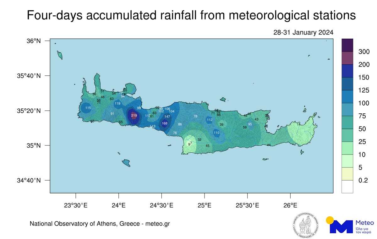 Όπως προκύπτει από την καταγραφή του δικτύου των 62 σταθμών που λειτουργεί το Εθνικό Αστεροσκοπείο Αθηνών/meteo.gr στην Κρήτη, σημαντικές ήταν και οι βροχοπτώσεις που σημειώθηκαν σε περιοχές του Ρεθύμνου (Σπήλι, Φράγμα Ποταμών) με το ύψος βροχής να φτάνει τα 150 χιλιοστά. Σε ακόμα δέκα σταθμούς του νησιού, το συνολικό ύψος βροχής ξεπέρασε τα 100 χιλιοστά.