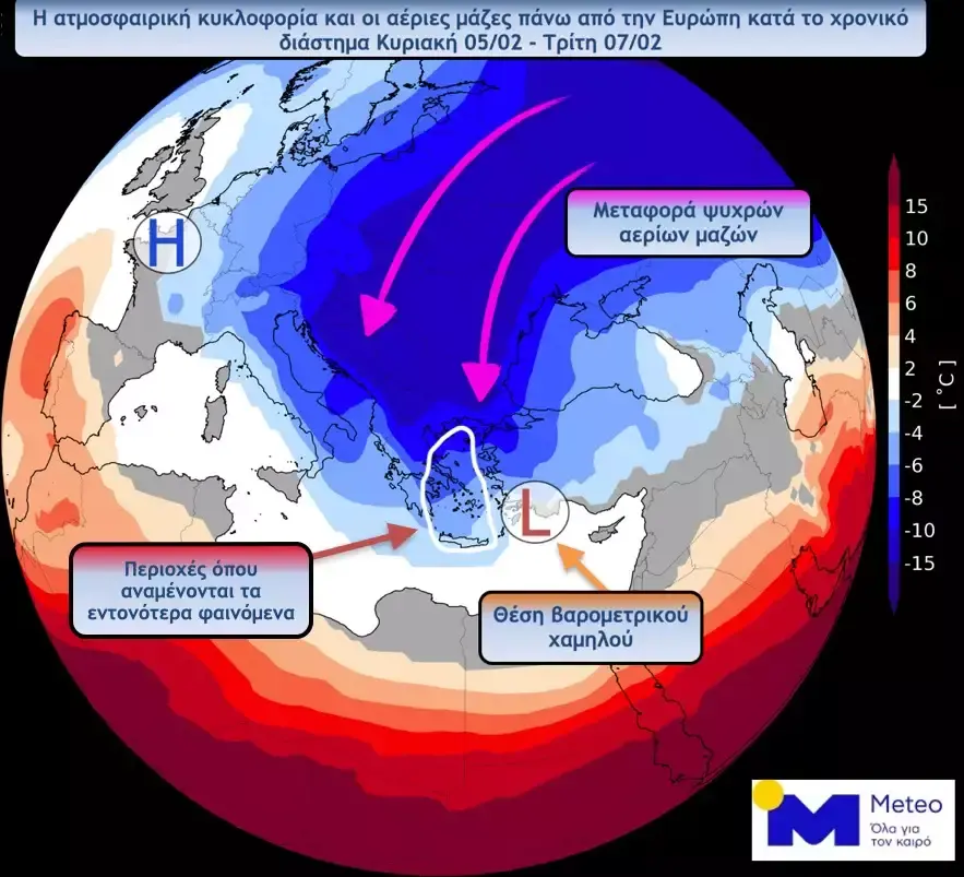 Αιτία για αυτή τη μεταβολή του καιρού θα είναι η ατμοσφαιρική κυκλοφορία πάνω από την Ευρώπη τις επόμενες ημέρες, η οποία θα χαρακτηριστεί από την ανάπτυξη ενός πεδίου υψηλών πιέσεων που θα εκτείνεται από τη Βορειοδυτική Αφρική έως τη Σκανδιναβία που σε συνδυασμό με τις χαμηλές πιέσεις στην Ανατολική και Νοτιοανατολική Ευρώπη θα επιτρέψει την μεταφορά ψυχρών αερίων μαζών προς τα Βαλκάνια και τη χώρα μας.