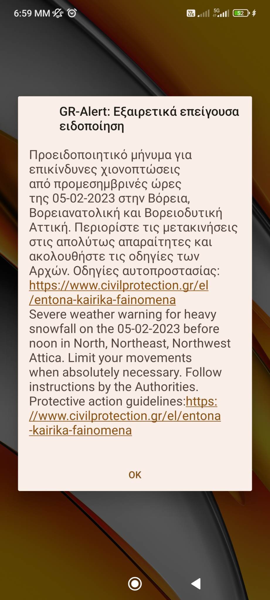Συγκεκριμένα το μήνυμα αναφέρει: « Προειδοποιητικό μήνυμα για επικίνδυνες χιονοπτώσεις από προμεσημβρινές ώρες της 5/2/2023 στην βόρεια, βορειοανατολική και βορειοδυτική Αττική. Περιορίστε τις μετακινήσεις στις απολύτως απαραίτητες και ακολουθήστε τις οδηγίες των Αρχών. Οδηγίες αυτοπροστασίας:https://www.civilprotection.gr/el/entona-kairika-fainomena ».