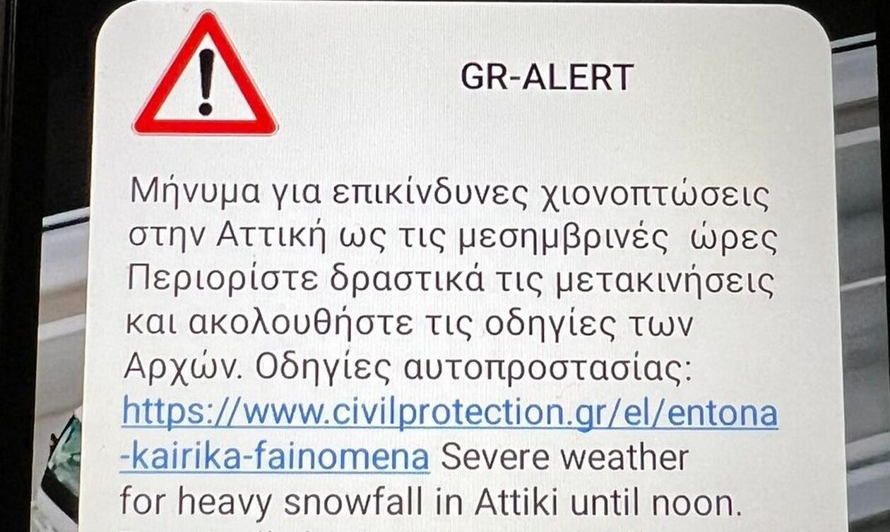 «Μήνυμα για επικίνδυνες χιονοπτώσεις στην Αττική ως τις μεσημβρινές ώρες. Περιορίστε δραστικά τις μετακινήσεις και ακολουθήστε τις οδηγίες των Αρχών» αναφέρει το μήνυμα του 112, ενώ υπάρχει και link που παραπέμπει σε αναλυτικές οδηγίες αυτοπροστασίας.