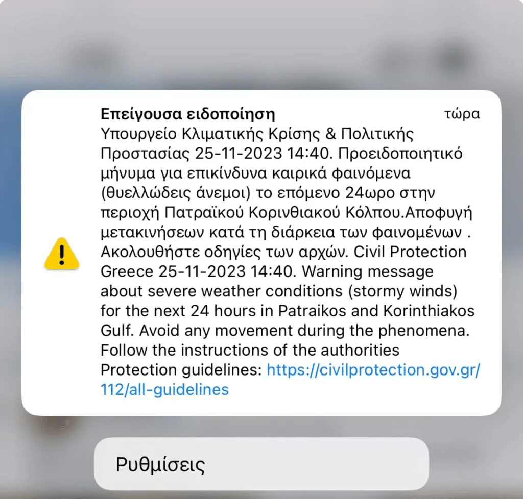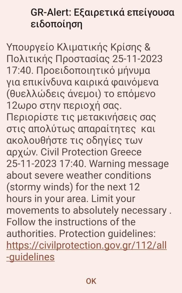 Συγκεκριμένα το μήνυμα αναφέρει: «Υπουργείο Κλιματικής Κρίσης & Πολιτικής Προστασίας 25-11-2023 14:15. Προειδοποιητικό μήνυμα για επικίνδυνα καιρικά φαινόμενα (θυελλώδεις άνεμοι) το επόμενο 24ωρο στην περιοχή σας. Αποφύγετε τις μετακινήσεις κατά τη διάρκεια των φαινομένων και ακολουθήστε τις οδηγίες των αρχών. Civil Protection Greece 25-11-2023 14:15».