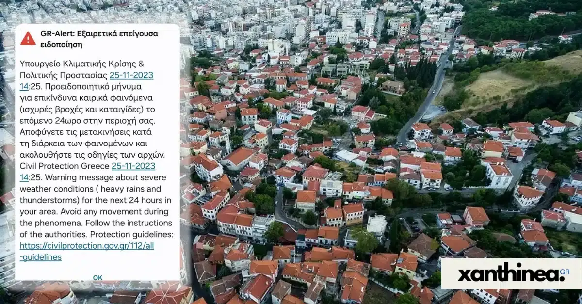 Μήνυμα από το 112 έλαβαν το μεσημέρι του Σαββάτου (λίγο πριν τις 14:30) στα κινητά τους οι κάτοικοι της Ξάνθης, όπως μεταδίδει η τοπική ιστοσελίδα xanthinea.gr