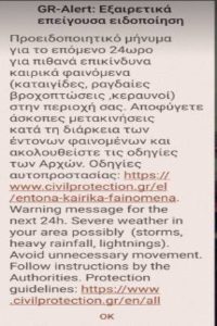 Το μήνυμα αναφέρει: «Προειδοποιητικό μήνυμα για το επόμενο 24ωρο για πιθανά επικίνδυνα καιρικά φαινόμενα (καταιγίδες, ραγδαίες βροχοπτώσεις, κεραυνοί) στην περιοχή σας.