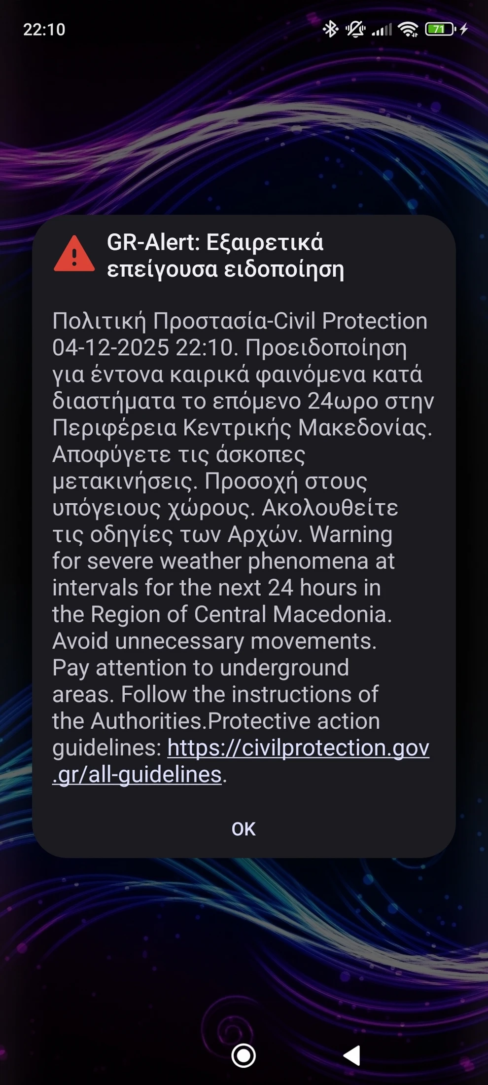 Στο μήνυμα αναφέρεται: «Προειδοποίηση για έντονα καιρικά φαινόμενα κατά διαστήματα μέχρι αύριο το μεσημέρι στην Περιφέρεια Αττικής. Αποφύγετε τις άσκοπες μετακινήσεις. Προσοχή στους υπόγειους χώρους. Ακολουθείτε τις οδηγίες των Αρχών».