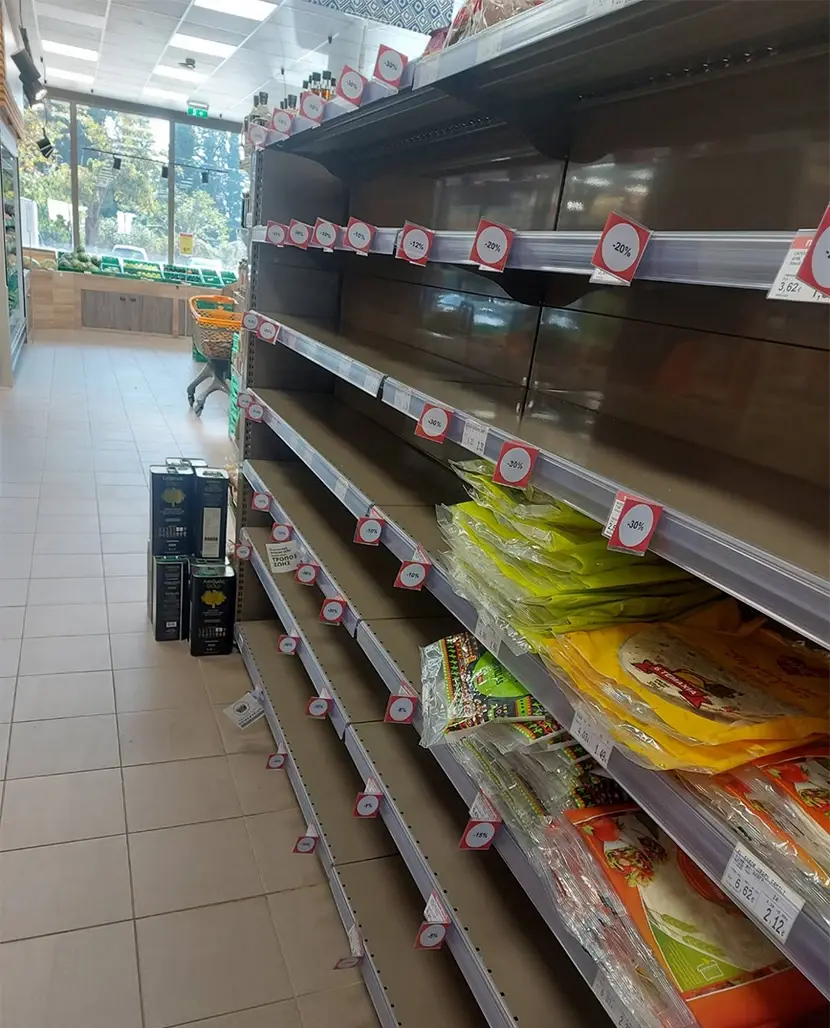 Η τροφοδοσία ουσιαστικά ανύπαρκτη. Τέταρτη μέρα σήμερα αποκλεισμού και τα ράφια στα σούπερ μάρκετ σχεδόν άδεια σε βασικά προϊόντα, διατροφικά και υγιεινής. Εμφιαλωμένο νερό δεν υπάρχει πουθενά, γαλακτοκομικά, όσπρια, μακαρόνια, αλεύρι, είδη όλα τους σε ανεπάρκεια.
