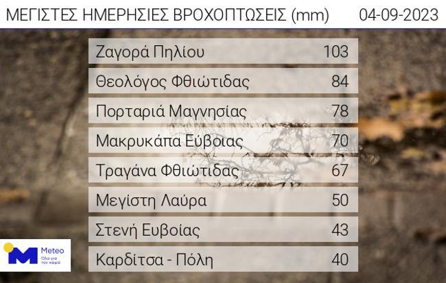Σύμφωνα με το δίκτυο αυτόματων μετεωρολογικών σταθμών του Εθνικού Αστεροσκοπείου Αθηνών το μεγαλύτερο ύψος βροχής έως τις 18:30 καταγράφηκε στη Ζαγορά Πηλίου και είναι ίσο με 103 χιλιοστά. Όπως έχει σημειωθεί σε προηγούμενη ανακοίνωσή μας η περιοχή της Ζαγοράς και την μαγνησίας γενικότερα περιλαμβάνεται σε αυτές όπου αναμένονται τα ισχυρότερα φαινόμενα με τα μεγαλύτερα ύψη βροχής. Στον σχετικό πίνακα παρουσιάζονται οι 8 σταθμοί του δικτυού που κατέγραψαν τα μεγαλύτερα ύψη βροχής.