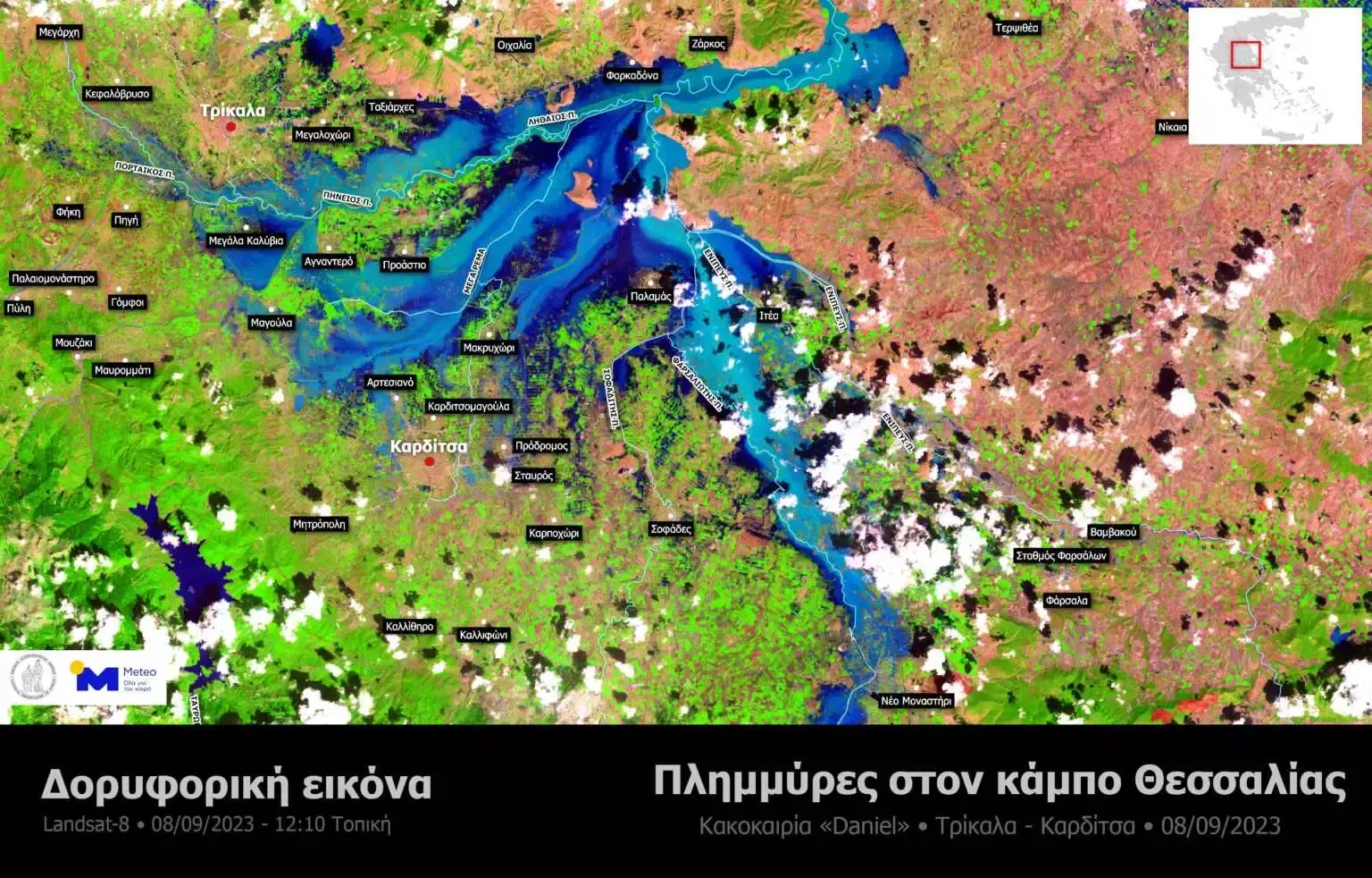 Το meteo παρουσιάζει την εικόνα στη Θεσσαλία μετά την κακοκαιρία από τον δορυφόρο Landsat-8, στην οποία φαίνεται ότι μεγαλύτερο μέρος των Τρικάλων και της Καρδίτσας έχουν πλημμυρίσει από τους χείμαρρους και τα νερά του Πηνειού, ο οποίος βρίσκεται στα όρια της υπερχείλισης και μέσα στην πόλη της Λάρισας.