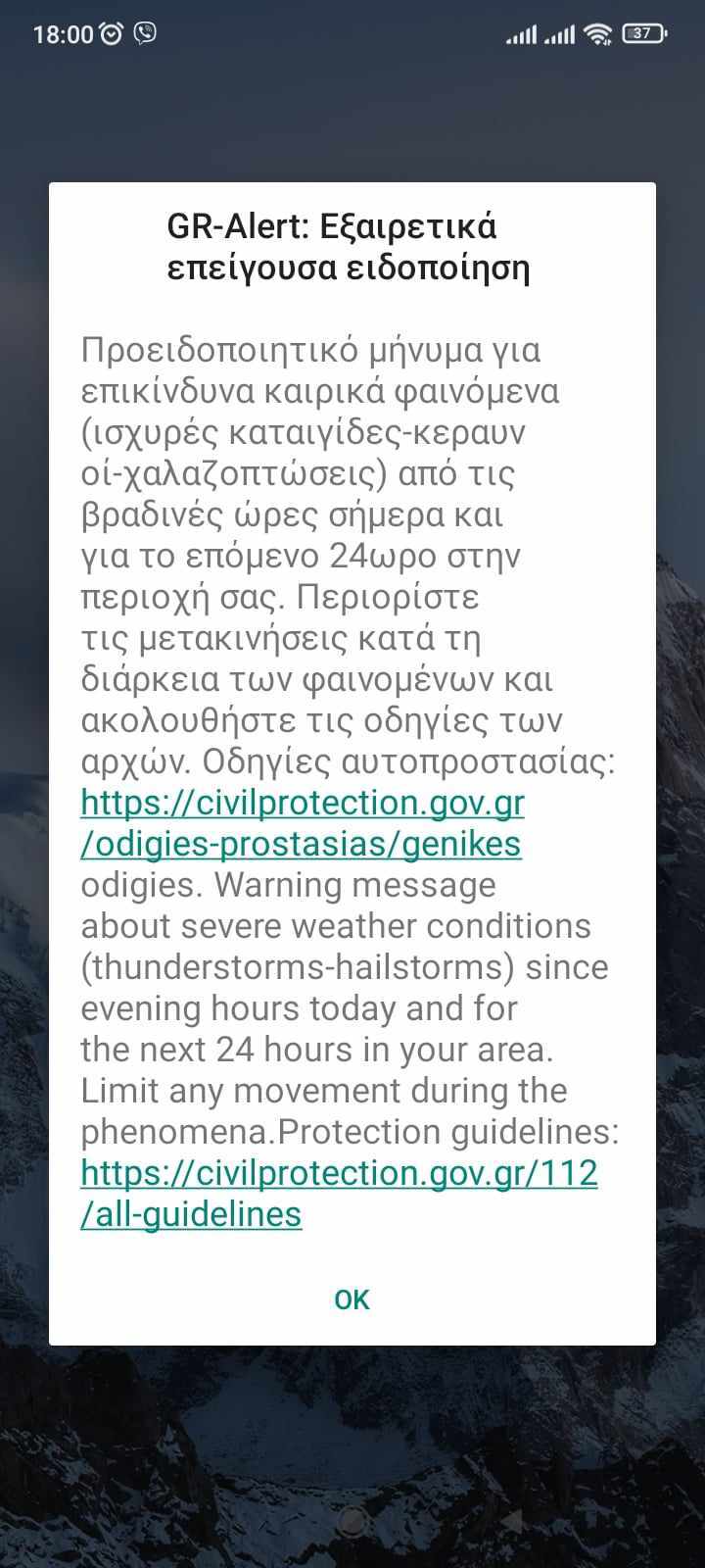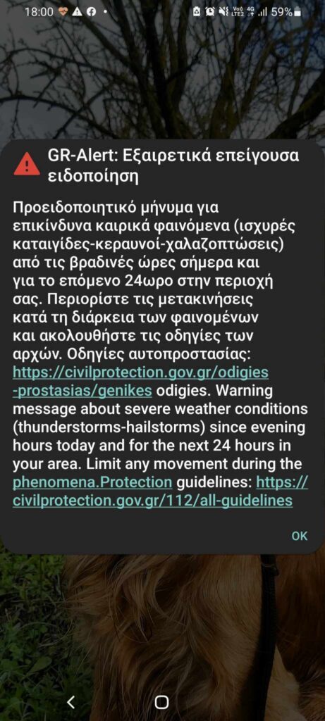 «Επείγουσα ειδοποίηση Προειδοποιητικό μήνυμα για επικίνδυνα καιρικά φαινόμενα (ισχυρές καταιγίδες- κεραυνοί-χαλαζοπτώσεις) από τις βραδινές ώρες σήμερα και για το επόμενο 24ωρο στην περιοχή σας. Περιορίστε τις μετακινήσεις κατά τη διάρκεια των φαινομένων και ακολουθήστε τις οδηγίες των αρχών».