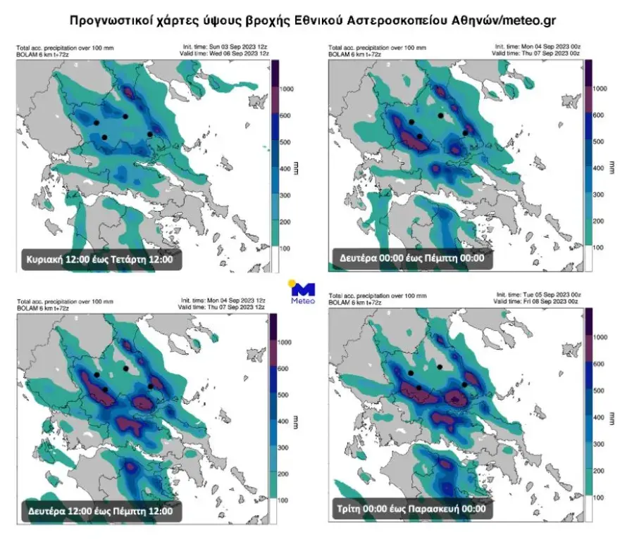 Οι χάρτες που παρουσιάζονται δείχνουν το συνολικό προβλεπόμενο ύψος βροχής σε χιλιοστά με χρονικό ορίζοντα 72 ωρών από τις 4 αρχικοποιήσεις του αριθμητικού μοντέλου πρόγνωσης καιρού του Εθνικού Αστεροσκοπείου Αθηνών/meteo.gr μεταξύ Κυριακής 3 και Τρίτης 5 Σεπτεμβρίου 2023.