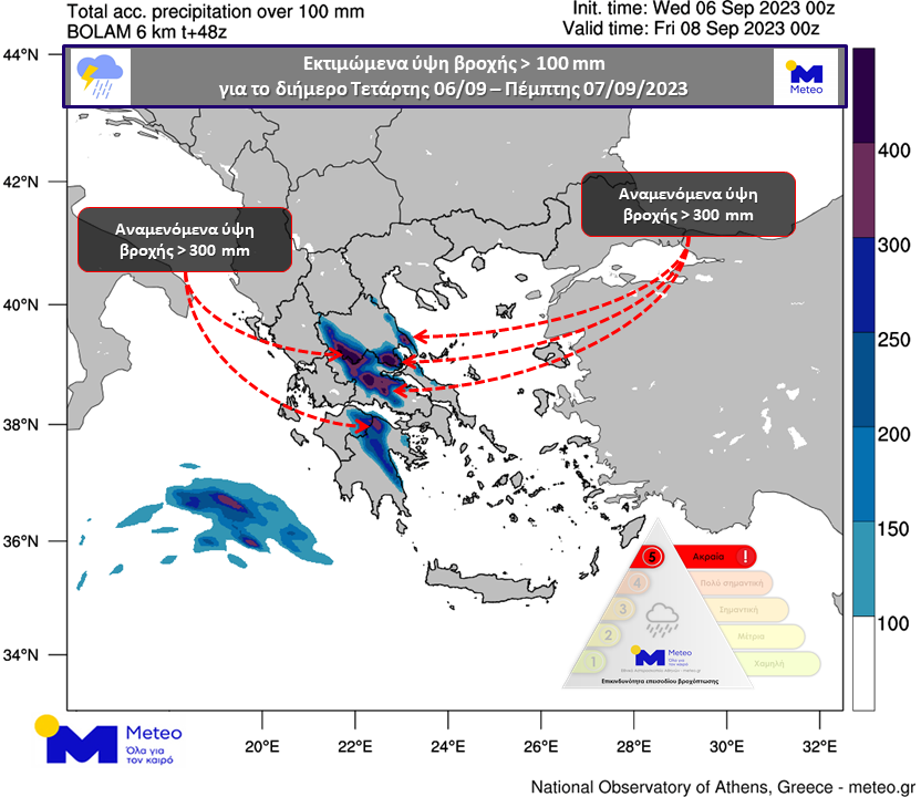 Για το διήμερο Τετάρτης 06/09 και Πέμπτης 07/09, τα πολύ μεγάλα ύψη βροχής που αναμένονται, θα επιδράσουν σωρευτικά στο ήδη κορεσμένο έδαφος, εντείνοντας τα προβλήματα από τα πλημμυρικά επεισόδια. Στον Χάρτη που ακολουθεί, επισημαίνονται οι περιοχές όπου αναμένονται ύψη βροχής > 100 mm, για το χρονικό διάστημα από την Τετάρτη 06/09 έως το βράδυ της Πέμπτης 07/09/2023. Υπενθυμίζεται ότι 1 mm βροχής αντιστοιχεί σε ένα λίτρο νερού σε μια επιφάνεια 1 τετραγωνικού μέτρου (ή ενός τόνου σε ένα στρέμμα).