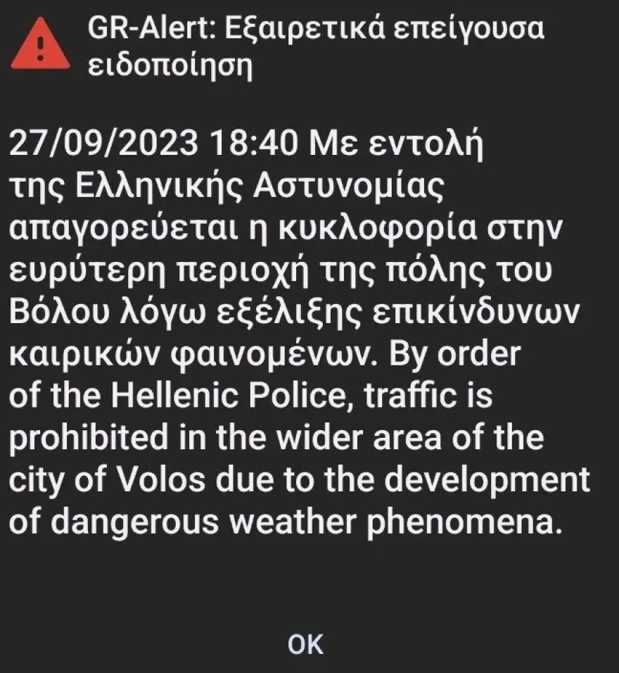 «Με εντολή της Ελληνικής Αστυνομίας απαγορεύεται η κυκλοφορία στην ευρύτερη περιοχή της πόλης του Βόλου λόγω εξέλιξης επικίνδυνων καιρικών φαινομένων», αναφέρει το μήνυμα του 112 που ήχησε στα κινητά των κατοίκων, λόγω της επέλασης της κακοκαιρίας Elias.
