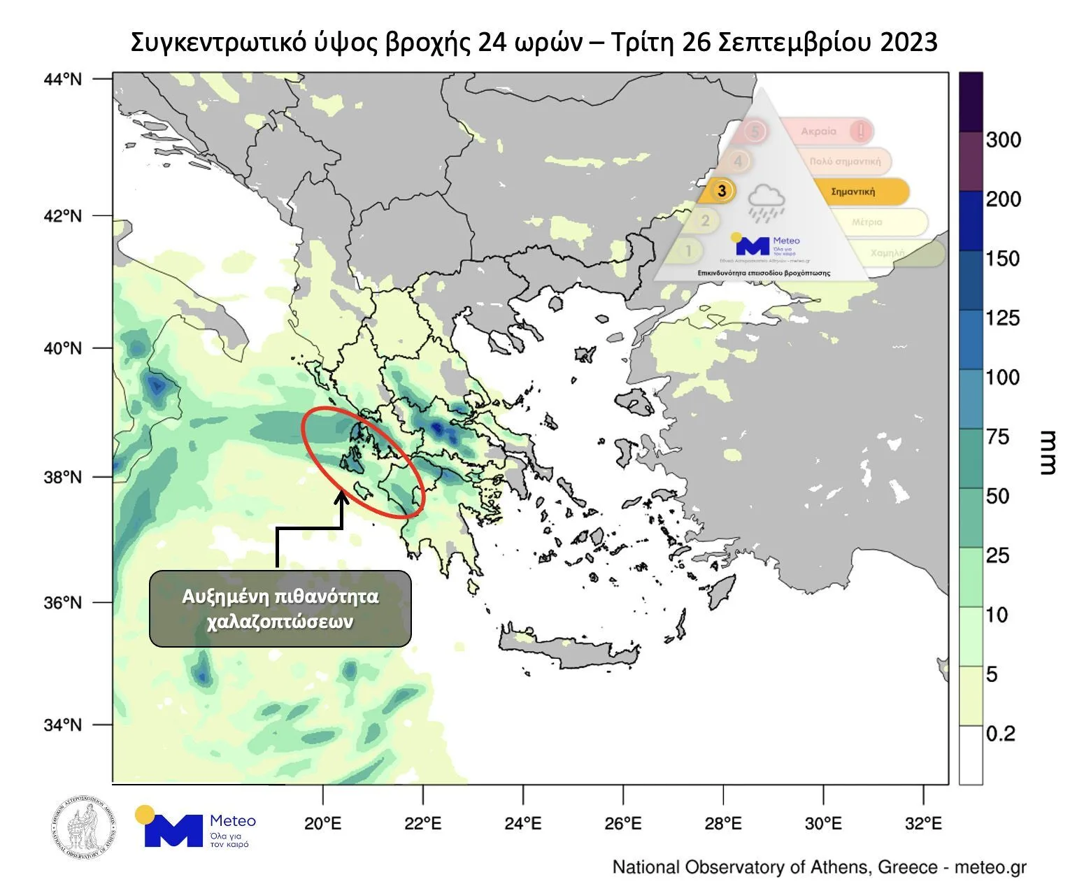 Σύμφωνα με την κατηγοριοποίηση του επεισοδίου βροχόπτωσης (RPI), η οποία εφαρμόζεται από τη μονάδα Meteo του Εθνικού Αστεροσκοπείου Αθηνών, το επεισόδιο βροχόπτωσης την Τρίτη 26/09 κατατάσσεται στην Κατηγορία 3 (Σημαντική), ενώ την Τετάρτη 27/09 θα αναβαθμιστεί στην Κατηγορία 4 (Πολύ Σημαντική).