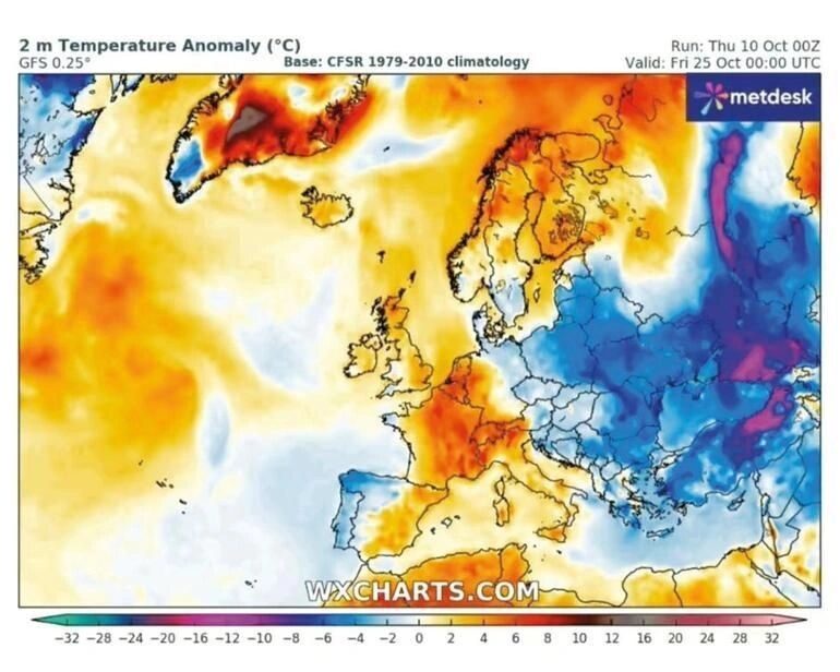 Όπως προειδοποιεί η μετεωρολογική πλατφόρμα WXCharts, οι νότιες ακτές της ηπείρου μας, συμπεριλαμβανομένης της χώρας μας, θα βιώσουν μια σημαντική πτώση της θερμοκρασίας από τις 25 Οκτωβρίου και μετά.