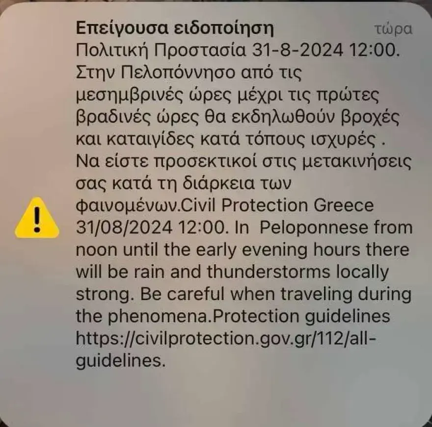Μάλιστα λίγο μετά τις 12:00 χτύπησε το 112 στην Πελοπόννησο καθώς όπως αναγράφεται σε αυτό, «από τις μεσημβρινές ως τις πρώτες βραδινές ώρες θα εκδηλωθούν βροχές και καταιγίδες κατά τόπους ισχυρές. Να είστε προσεκτικοί στις μετακινήσεις σας κατά τη διάρκεια των φαινομένων».