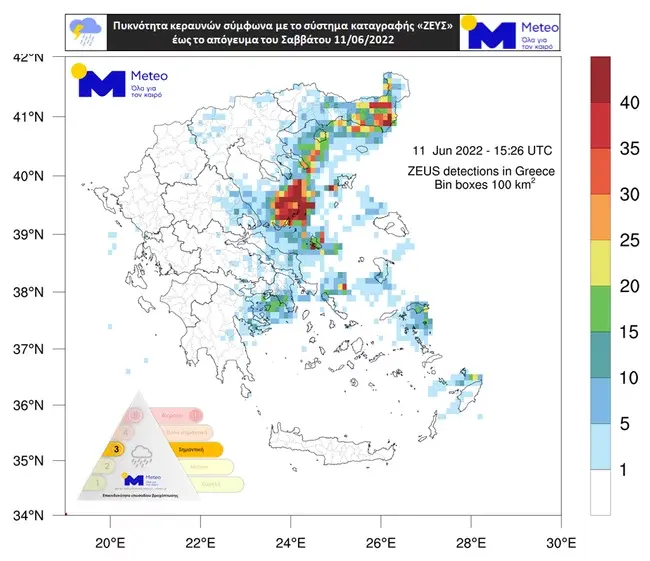 Το σύστημα καταγραφής κεραυνών «ΖΕΥΣ» του Εθνικού Αστεροσκοπείου Αθηνών κατέγραψε περίπου 8.300 κεραυνούς έως την ίδια ώρα. Όπως φαίνεται στον χάρτη που παρουσιάζει την πυκνότητα κεραυνών, οι περισσότεροι ανιχνεύθηκαν στην Θράκη, στο Βόρειο Αιγαίο, στην Εύβοια και στην Ανατολική Θεσσαλία και Στερεά, συμπεριλαμβανομένης της Αττικής.
