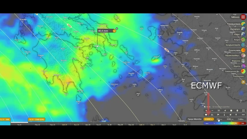 Το Ευρωπαϊκό μοντέλο εμφανίζεται πιο συγκρατημένο στα ύψη βροχής, με τιμές γύρω στα 40–60 mm για την Αττική. Το πλεονέκτημά του δεν είναι η “ένταση”, αλλά η χρονική συνοχή: από τρέξιμο σε τρέξιμο δεν παρουσιάζει απότομες διακυμάνσεις και αποτυπώνει καλύτερα τη διάρκεια του υετού. Αυτή η συμπεριφορά το καθιστά συχνά πιο αξιόπιστο σε επεισόδια παρατεταμένης βροχής, χωρίς έντονη καταιγιδογενή δομή.