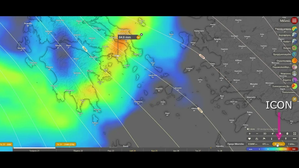 Το ICON δίνει σαφώς υψηλότερα αθροίσματα, με τοπικές τιμές που προσεγγίζουν ή ξεπερνούν τα 80 mm. Συχνά κατηγορείται για “υπερβολή”, όμως σε τέτοιες περιπτώσεις λειτουργεί ως προειδοποιητικό σήμα: αναγνωρίζει καλύτερα τη δυναμική ανατροφοδότηση και τη δυνατότητα τοπικών ραγδαιοτήτων. Δεν σημαίνει ότι θα επαληθευτεί πλήρως, αλλά ότι το ταβάνι του κινδύνου είναι υψηλότερο από αυτό που δείχνουν τα πιο συντηρητικά σενάρια.