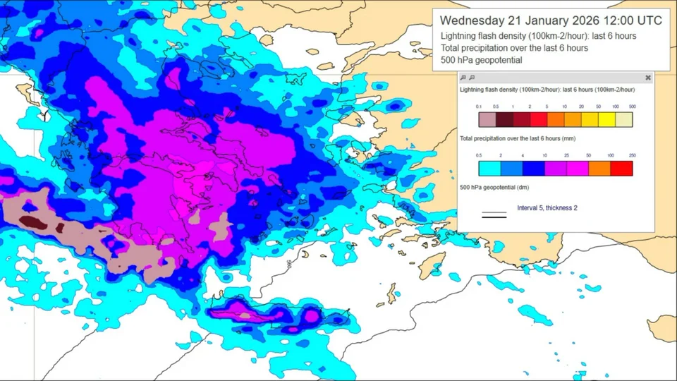 Εδώ εμφανίζεται καθαρά η ταχύτερη έλευση των βροχών. Η ζώνη υετού εξαπλώνεται γρήγορα προς την κεντρική και ανατολική Ελλάδα, με πιο συνεκτικά και εκτεταμένα φαινόμενα. Παράλληλα, κάνουν την εμφάνισή τους σποραδικοί κεραυνοί ενσωματωμένοι μέσα στη γενικευμένη βροχή. Είναι το χρονικό σημείο όπου η ανώτερη δυναμική “κουμπώνει” με την υγρασία και αυξάνει τον κίνδυνο τοπικών ραγδαιοτήτων. Εδώ οι περισσότερες βροχές στην Αττική έρχονται νωρίτερα και πιο οργανωμένα απ’ ό,τι θα ανέμενε κανείς από την χθεσινή πρωινή εικόνα. Η βροχή γίνεται πιο συνεχής, με τοπικές εντάσεις, κυρίως στα δυτικά και βόρεια του νομού, ενώ δεν αποκλείονται μεμονωμένοι κεραυνοί. Πρόκειται για τη χρονική ζώνη με τον μεγαλύτερο κίνδυνο υποεκτίμησης.