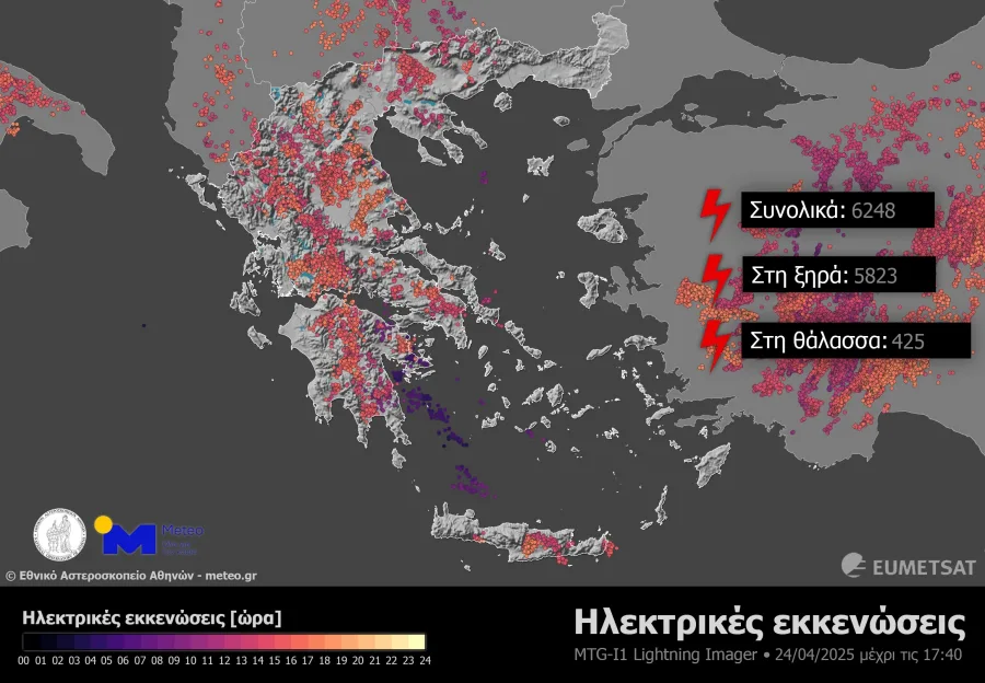 Η ανάλυση δεδομένων από τον Ευρωπαϊκό μετεωρολογικό δορυφόρο τρίτης γενιάς Meteosat-12 και το Lightning Imager (LI) όργανο που φέρει, έδειξε ότι μέχρι τις 17:40 της Πέμπτης 24/04 έχουν καταγραφεί περισσότερες από 6.000 ηλεκτρικές εκκενώσεις. Σημειώνεται ότι ως ηλεκτρικές εκκενώσεις ορίζουμε το σύνολο αυτών που συμπεριλαμβάνει τους κεραυνούς (εκκενώσεις μεταξύ νεφών και εδάφους), τις ηλεκτρικές εκκενώσεις μεταξύ νεφών καθώς και τις ηλεκτρικές εκκενώσεις μεταξύ νεφών και του περιβάλλοντος αέρα.