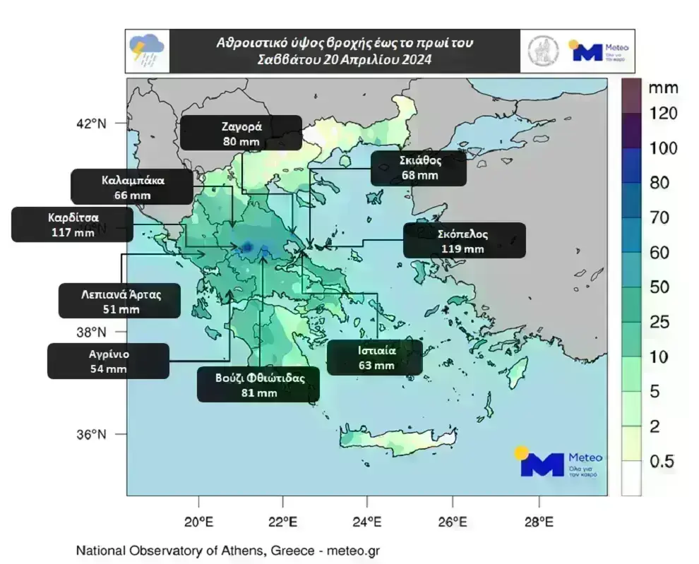 Σύμφωνα με το δίκτυο αυτόματων μετεωρολογικών σταθμών του meteo.gr / Εθνικού Αστεροσκοπείου Αθηνών, το μέγιστο ύψος βροχής έως σήμερα καταγράφηκε στη Γλώσσα Σκοπέλου (119 χιλιοστά) και ακολούθησε η πόλη της Καρδίτσας (117 χιλιοστά).