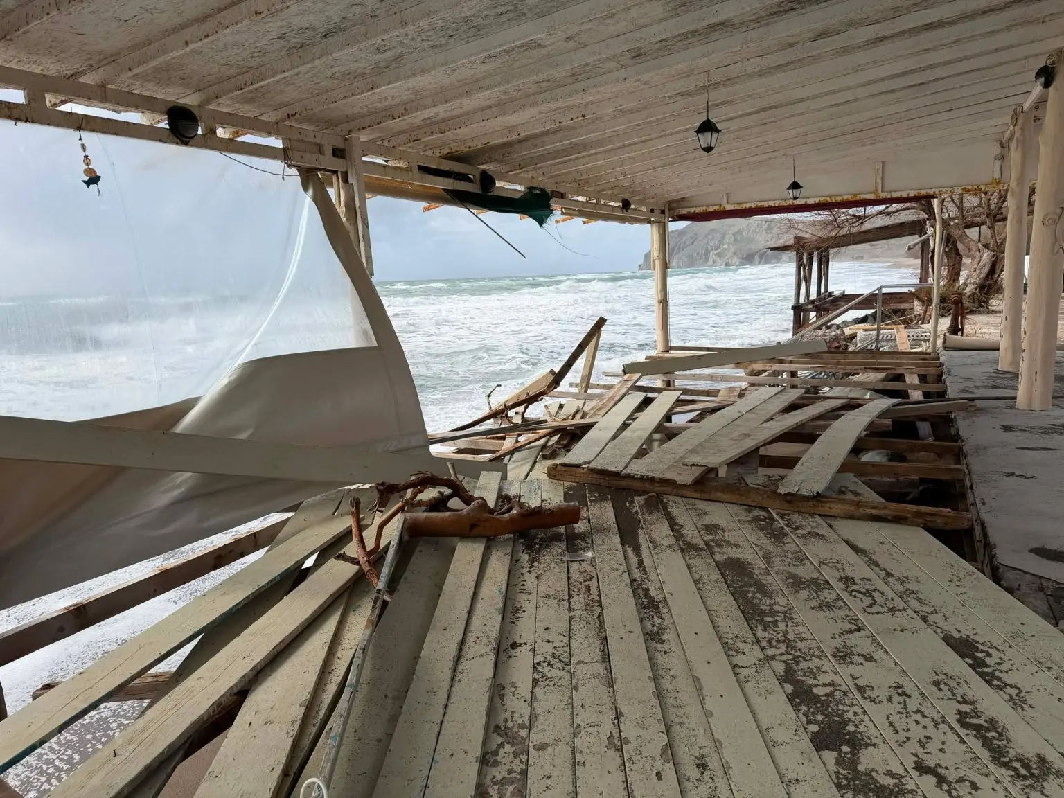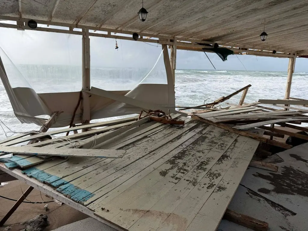 Οι ισχυροί άνεμοι, εντάσεως 10 με 11 μποφόρ. που έπνεαν χθες (16/2) στην περιοχή, έσπασαν το τοιχίο του παραλιακού δρόμου… Εξέδρες παρασύρθηκαν, καταστήματα πλημμύρισαν, αφού, λόγω της δύναμης των ανέμων, έσπασαν κεντρικές πόρτες καταστημάτων και γέμισαν νερό.