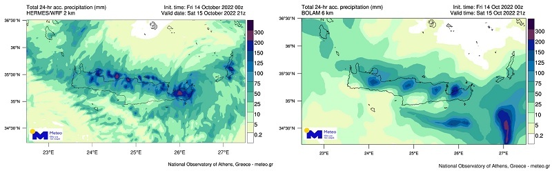 Οι δύο χάρτες του παρακάτω σχήματος δείχνουν το προβλεπόμενο ύψος βροχής 24ωρου σε χιλιοστά (λίτρα ανά τετραγωνικό μέτρο) το Σάββατο 15/10, από τα δεδομένα 2 προγνωστικών μοντέλων τα οποία χρησιμοποιεί επιχειρησιακά το Εθνικό Αστεροσκοπείο Αθηνών/meteo.gr. Η αρχικοποίηση των μοντέλων έγινε περίπου 30 ώρες πριν την εκδήλωση των καταστροφικών πλημμυρών στην Κρήτη, με τα αποτελέσματα των μοντέλων να προβλέπουν εγκαίρως και με μεγάλη ακρίβεια τις περιοχές που δέχθηκαν τα μεγαλύτερα ύψη βροχής.