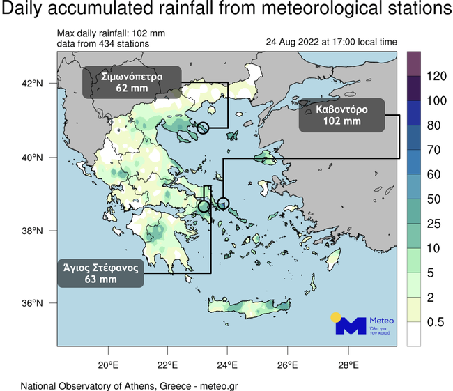 Πιο αναλυτικά, την Πέμπτη 25 Αυγούστου 2022, περιμένουμε βροχές και καταιγίδες στις περισσότερες περιοχές της χώρας. Τα φαινόμενα τοπικά θα έντονα κυρίως στα κεντρικά και βόρεια με έμφαση τμήματα της Κ. Μακεδονίας, της Αν. Θεσσαλίας, της Αν. Στερεάς, της Β. Εύβοιας, των Σποράδων και του Β. Αιγαίου. Οι καταιγίδες στην Ήπειρο και τη Δ. Μακεδονία είναι πιθανό να συνοδεύονται από τοπικές χαλαζοπτώσεις μικρού μεγέθους.