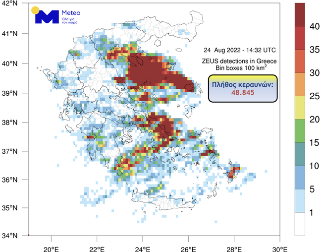Όπως αναφέρει το meteo, το σύστημα Ζευς κατέγραψε σχεδόν 50.000 κεραυνούς έως τις 5 το απόγευμα στην Ελλάδα, ενώ μεγάλα ύψη βροχής καταγράφηκαν σε πολλές περιοχές.