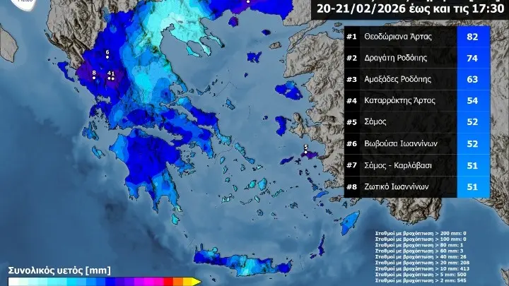 Μεγάλα ύψη βροχής καταγράφηκαν σε Ήπειρο και Θράκη, την Παρασκευή 20 και το Σάββατο 21 Φεβρουαρίου. Σύμφωνα με το δίκτυο αυτόματων μετεωρολογικών σταθμών του Εθνικού Αστεροσκοπείου Αθηνών / meteo.gr, το ύψος βροχής στα Θεοδώριανα ‘Αρτας το προαναφερόμενο διήμερο – έως σήμερα το απόγευμα -, έφτασε τα 82 mm.