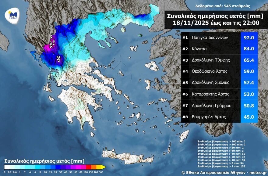 Σύμφωνα με δίκτυο αυτόματων μετεωρολογικών σταθμών του Εθνικού Αστεροσκοπείου Αθηνών / Meteo.gr τα μεγαλύτερα ύψη βροχής καταγράφηκαν στην Ήπειρο, όπως αποτυπώνεται στη χρωματική κλίματα του χάρτη, με το μεγαλύτερο ύψος βροχής μέχρι και τις 22:00 ώρα Ελλάδας να καταγράφεται στο Πάπιγκο Ιωαννίνων με 92.0 mm.