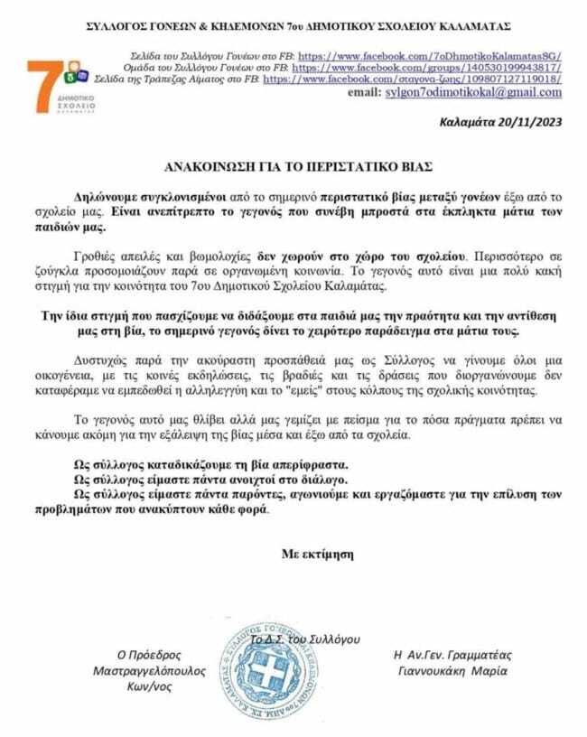 Ο Σύλλογος Γονέων και Κηδεμόνων, σε ανακοίνωσή του, καταδικάζει το περιστατικό και δηλώνει πως οι γονείς είναι «συγκλονισμένοι από το πρωτοφανές περιστατικό βίας».